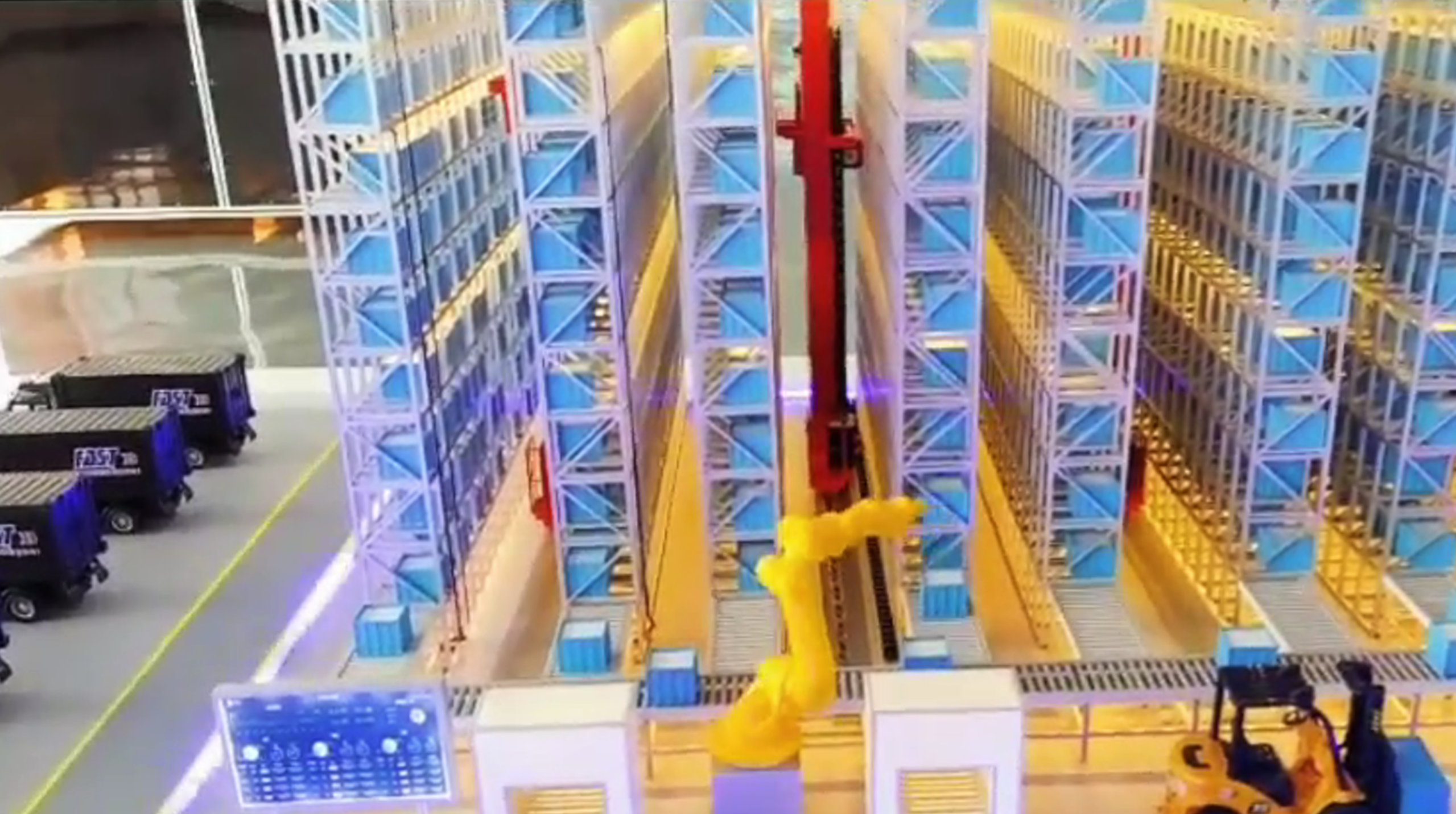 2. 高速精准作业:机械臂沿轨道升降与平移,通过精确定位系统,将货叉精准插入货箱底部,完成存取动作,全程无人干预。