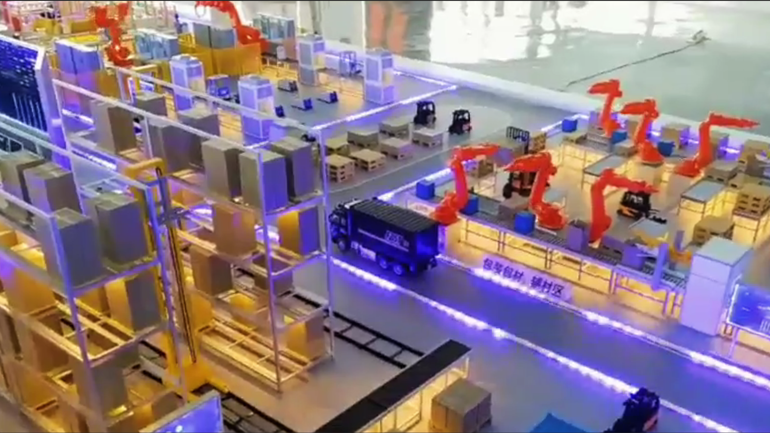 在微缩的仓储区,多台AGV(自动导引运输车)正沿着地面发光的路径,将货箱从入库点运至不同的货架前或加工线边。