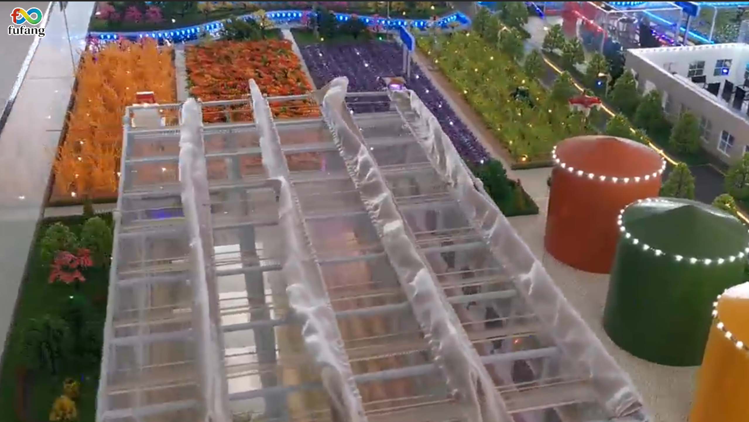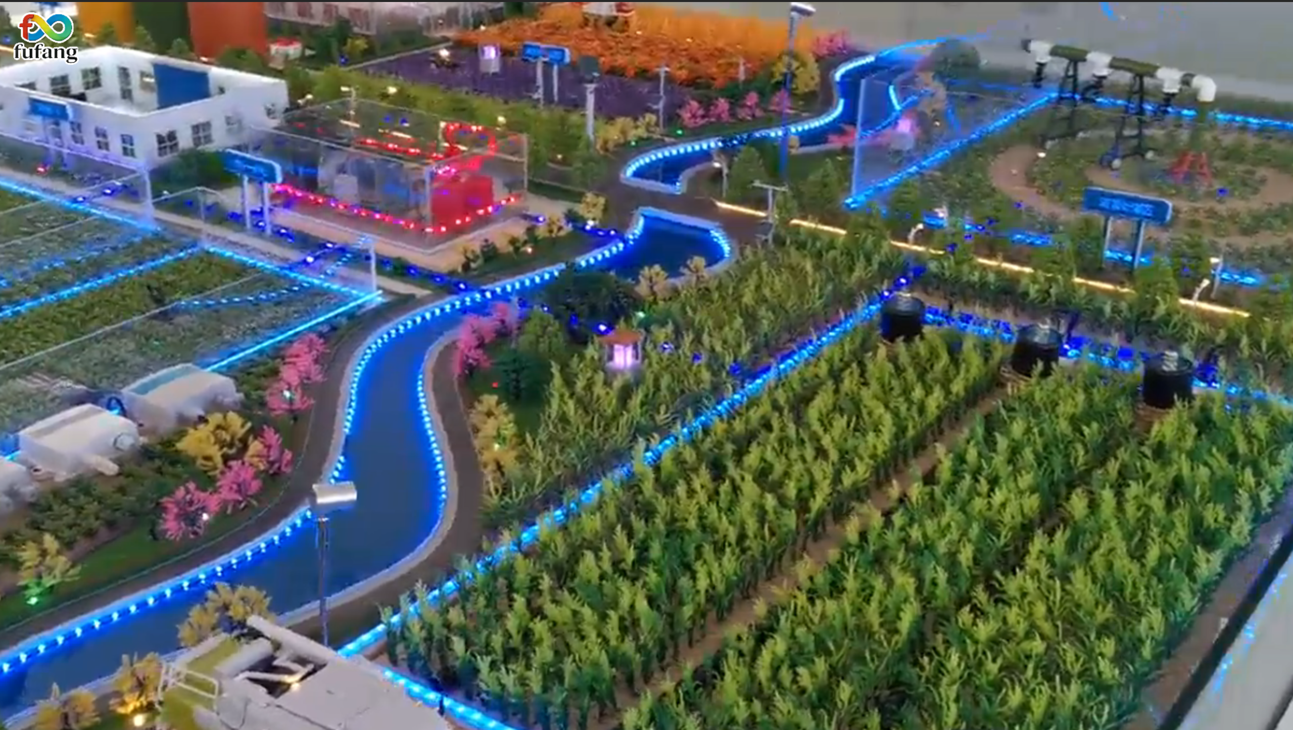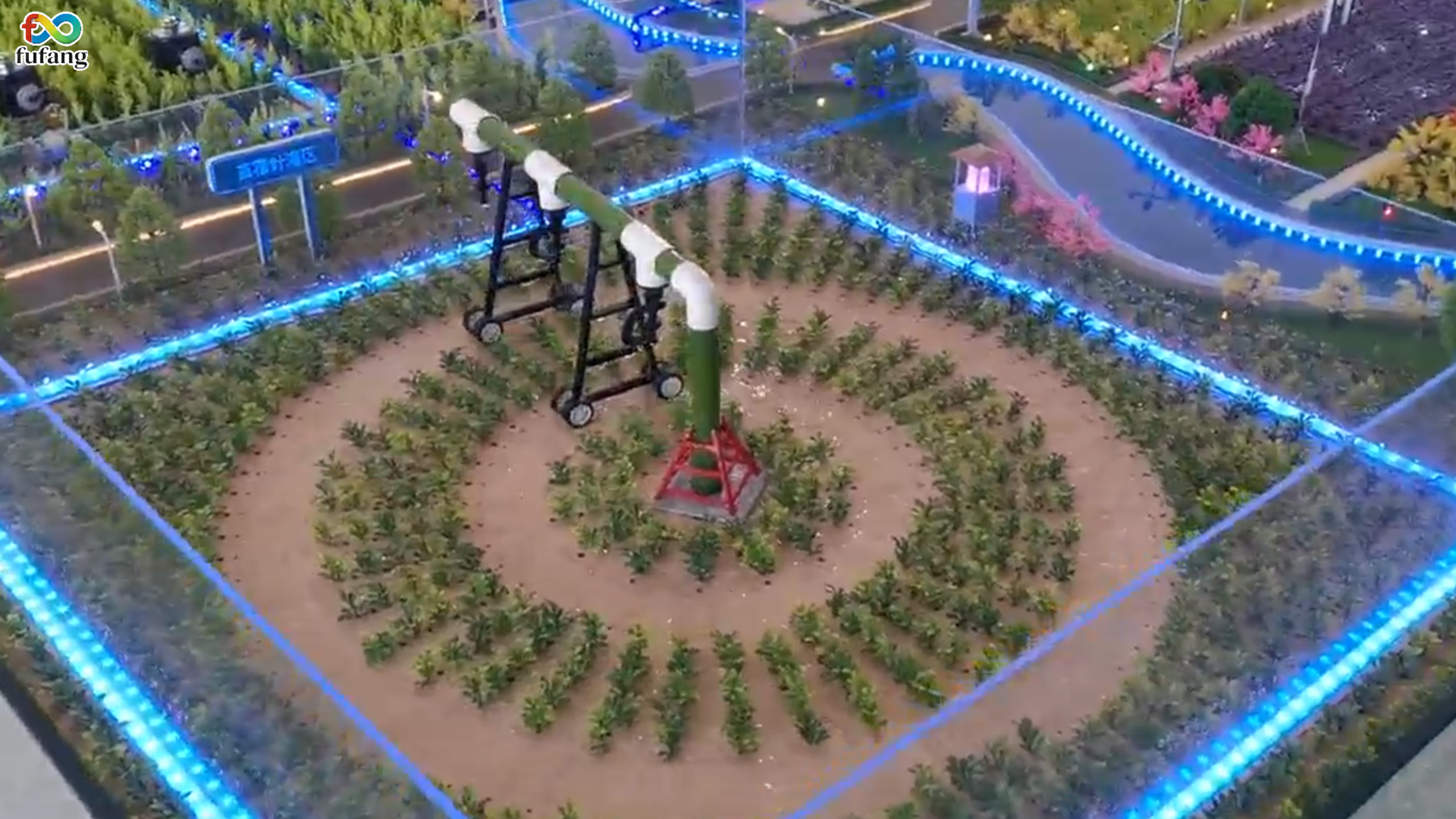 首先在精准滴灌系统展示图中,蓝色灯带模拟的监测与控制网络纵横交错,将其可视化。图中滴灌设备的细节排布,清晰传递出水分与养分直送作物根系的核心逻辑,直观呈现出“精准供给”这一名词。