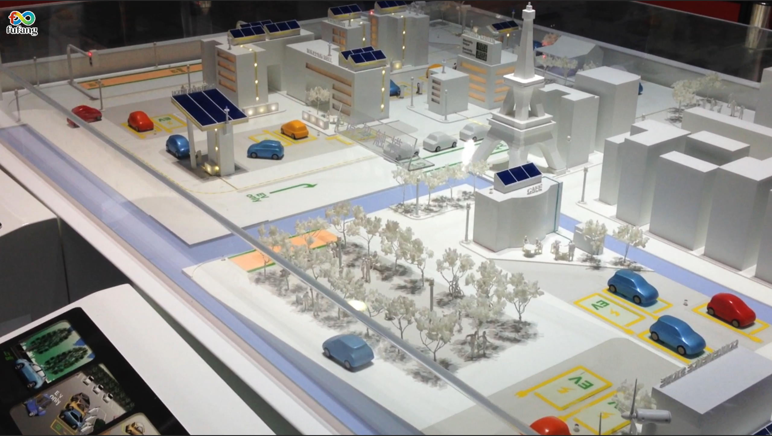 沙盘右侧功能区中,红蓝车辆自动完成停车、换乘与调度作业,配合第二块显示屏展示的EV专用行驶区、非接触式无线充电等模块,完整呈现智慧出行的全流程,凸显“交通—能源—服务”协同联动的智能化解决方案价值。