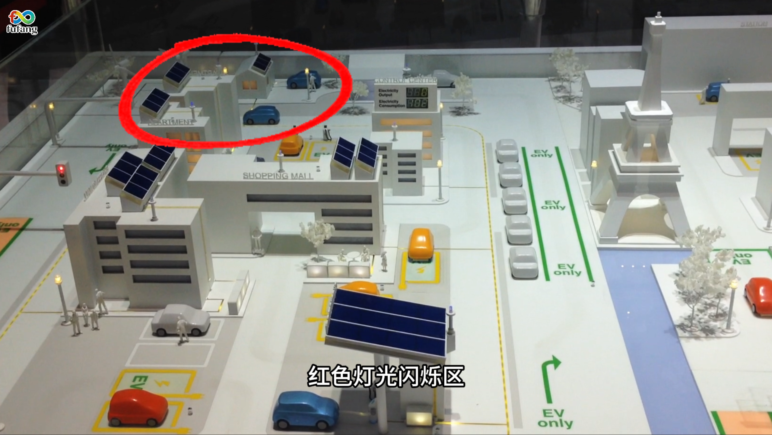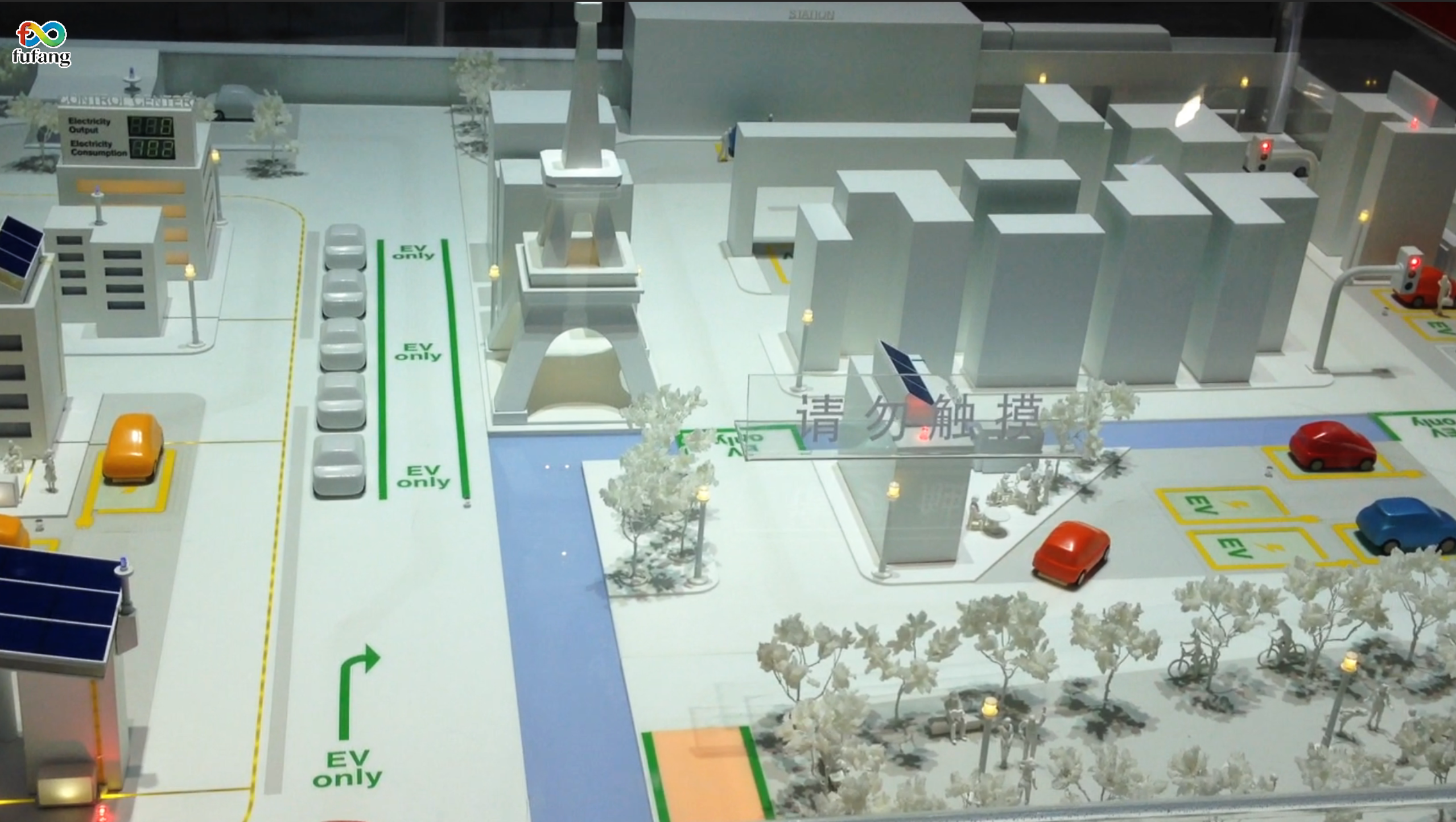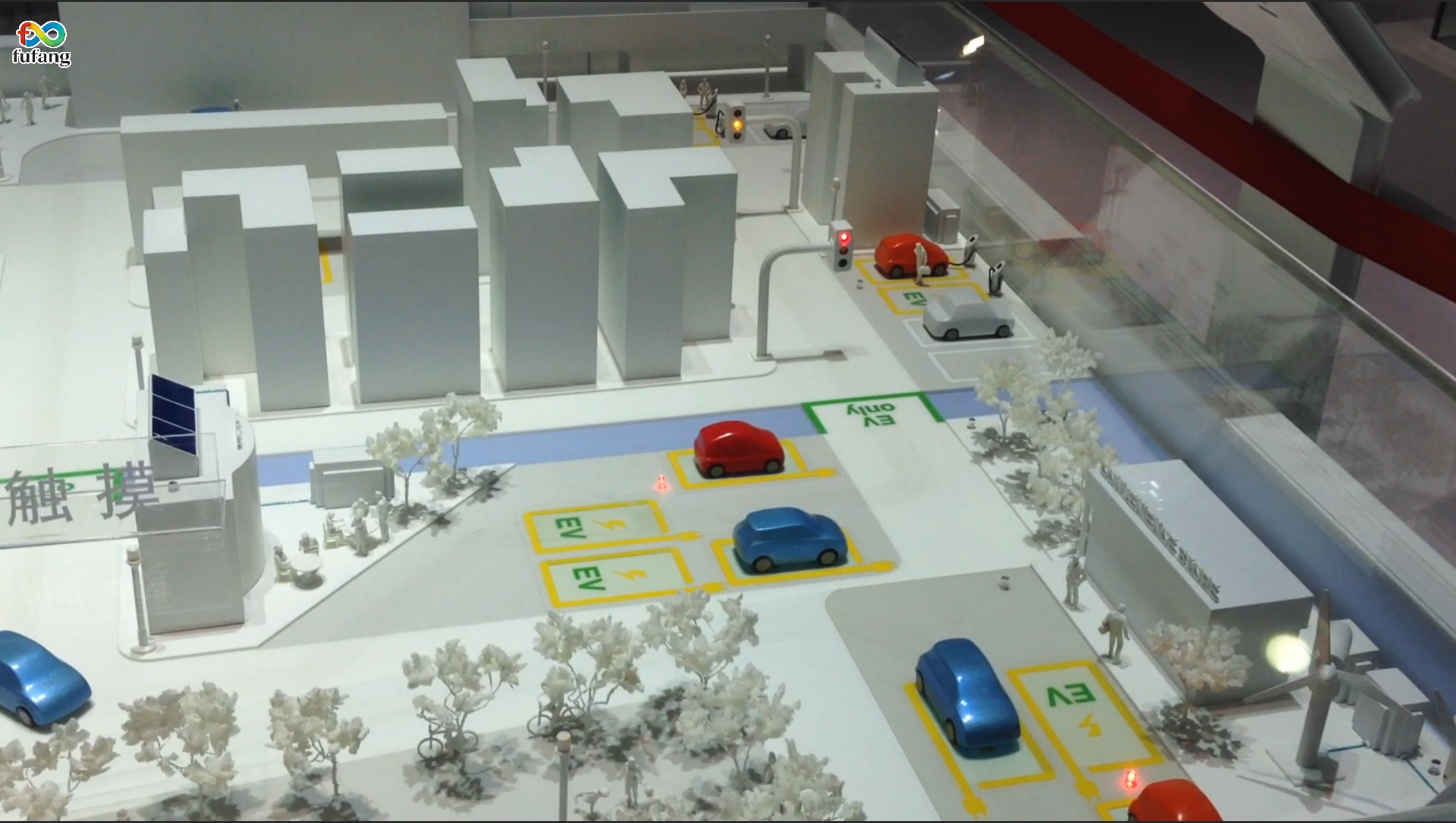 沙盘全域建筑屋顶覆盖的太阳能板与风能发电装置,清晰展现园区的绿色能源供应体系。这些装置与EV充电站点实时联动,当车辆驶入充电区时,对应区域的指示灯同步闪烁,直观展示了“发电—储能—充电”的闭环能源管理模式,让绿色低碳的能源理念从概念落地为可触摸的场景。