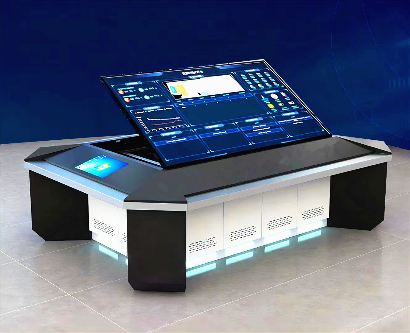 沙盘采用触摸一体机操作,智能程序控制。内容含智慧大温室、气象监测、水土质监测、水肥一体化、智能灌溉系统、智慧加...